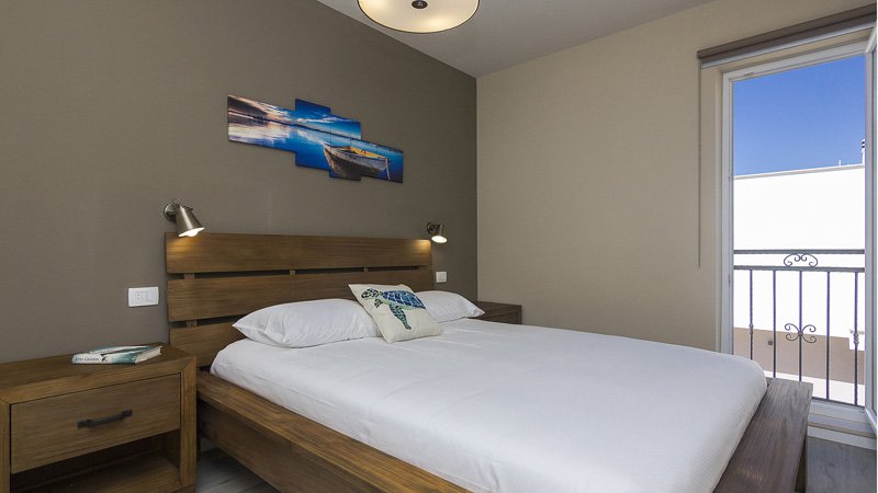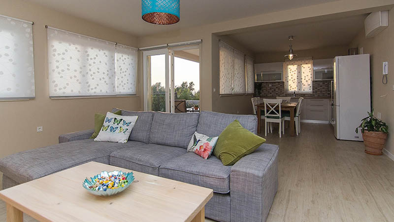 Lägenheten på andra våningen har tre sovrum och två badrum. Två sovrum med dubbelsängar och ett barnrum med våningssäng (70 x 180 cm). Ett stilrent, välutrustat kök och ett vardagsrum med fantastisk utsikt.