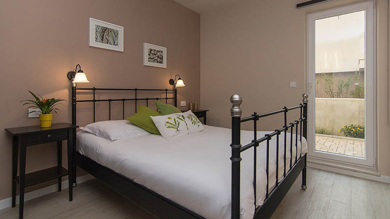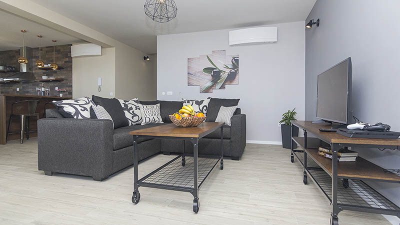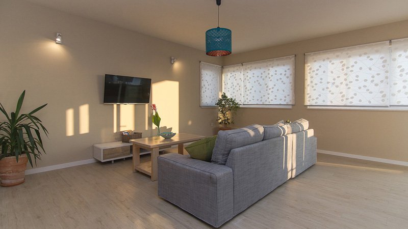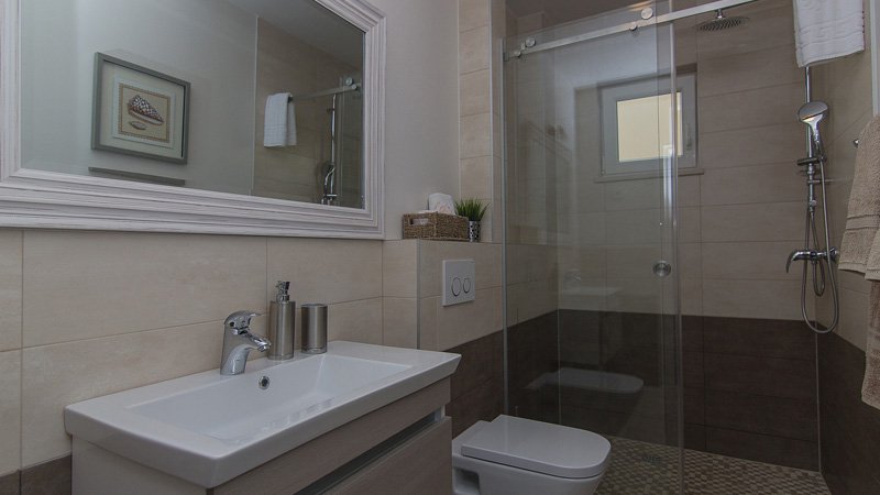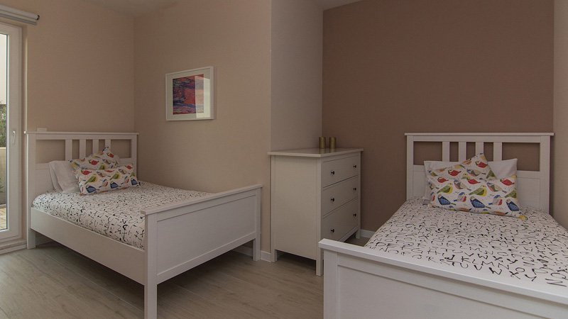 Lägenheten på första våningen (bottenvåningen) har tre sovrum och två badrum. Två sovrum med dubbelsängar och ett sovrum med två enkelsängar. Ett rymligt och välutrustat kök och ett mysigt och bekvämt vardagsrum.