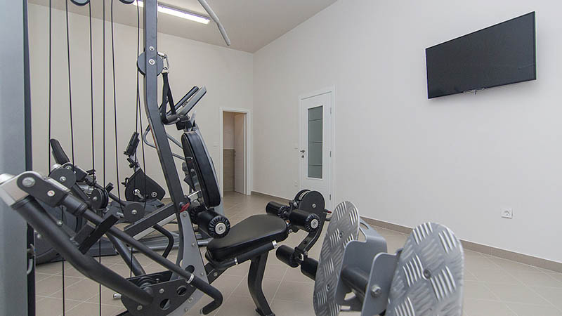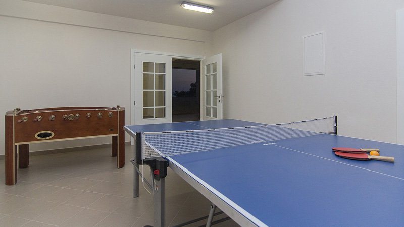 I källaren finns 2 garage, gym med konditions- och viktmaskiner, ett badrum och ett spelrum med pingisbord och fotbollsbord.