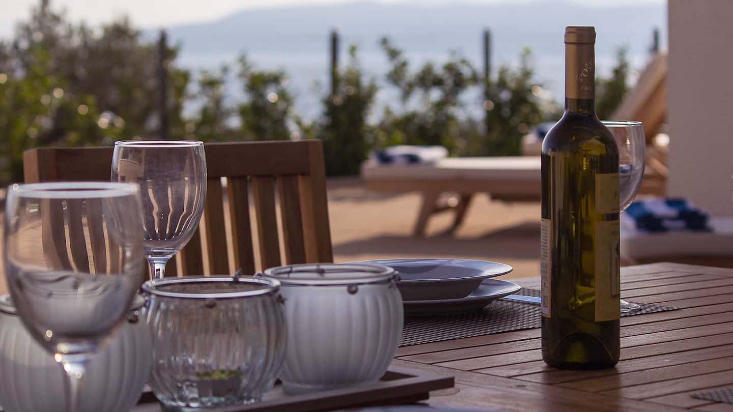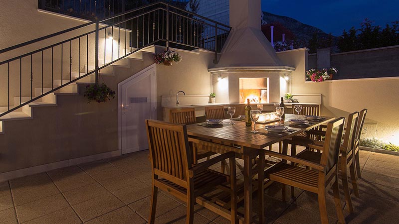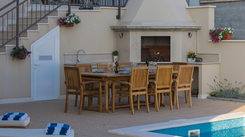 Utanför huset finns det gott om utrymme att umgås, med vacker utsikt över havet och öarna. Här finns en inbjudande pool med lounger, grillplats och stort matbord med stolar för underbara matupplevelser utomhus.